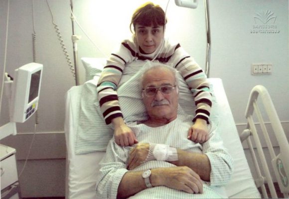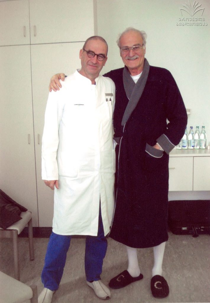 დამლოცა პატრიარქმა. თავზე ხელი დამადო – დალოცვილი იყავიო… ახლა წამოდი ზემოთ ვიტრაპეზოთო. ზემოთ უზარმაზარი სუფრაა გაშლილი და ტორტი დევს. ამას ხელი არავინ მოჰკიდოს, ბატონი კახი გერმანიაში მიბრძანდება სამკურნალოდო…