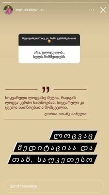 ამჯერად, Instagram-ის მეშვეობით ნანუკა გამომწერებს მედიტაციის მნისვნელობაზე ესაუბრება და საკუთარ გამოცდილებას უზიარებს.