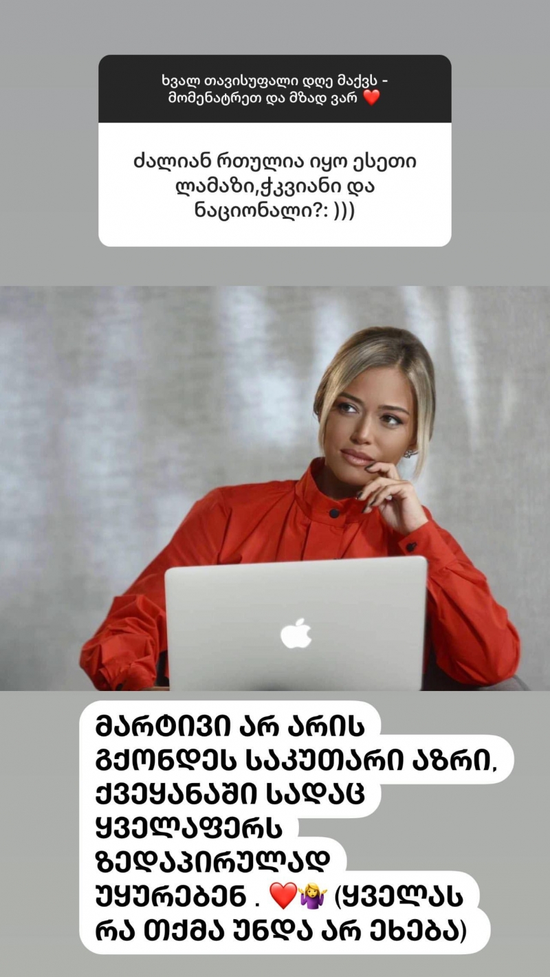 ტელეწამყვანი თათია შარანგია, ​ამჯერად კითხვებს პოლიტიკურ გემოვნებასთან დაკავშირებით „ინსტაგრამაზე“ იღებს: „მარტივი არ არის, გქონდეს საკუთარი აზრი ქვეყანაში, სადაც ყველაფერს ზედაპირულად უყურებენ. ყველას, რა თქმა უნდა, არ ეხება“ – წერს ის.